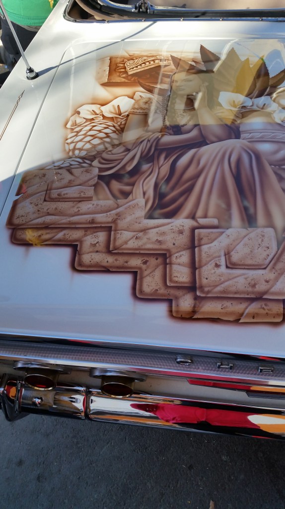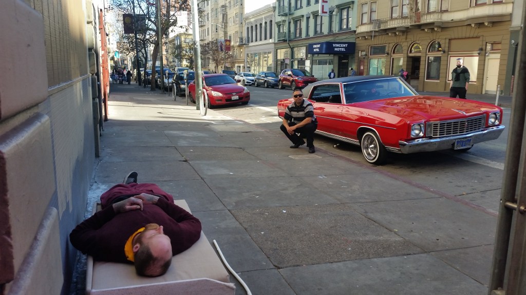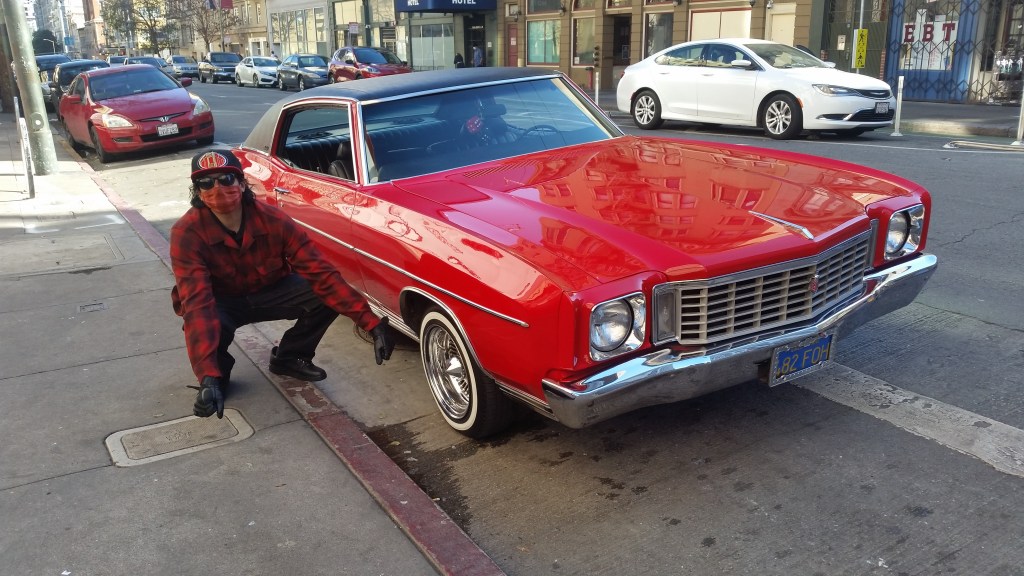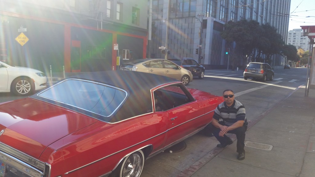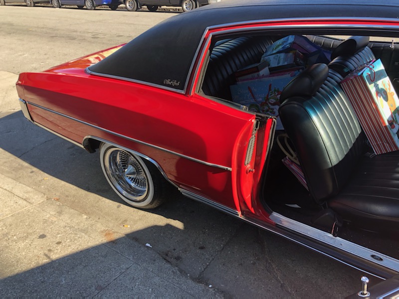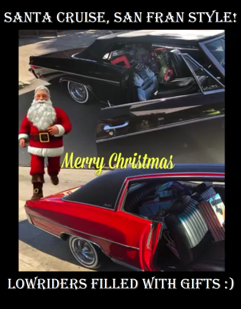 To be Santa Clause in a lowrider—I mean, who thinks of this, who can imagine such cariño, tender love? LA MISION, SAN FRAN! Isn’t it every vato’s dream, to lowride through the City, singing to oldies and arguing about the best route for the Red Rudolf Monte Carlo sleigh to fly to all the heart hoods—La Mision, Bayview/Hunters Point, the TL Tenderloin—to gift presents plus extra 20 buck pops to the families and to the Homeless Homies around the way?