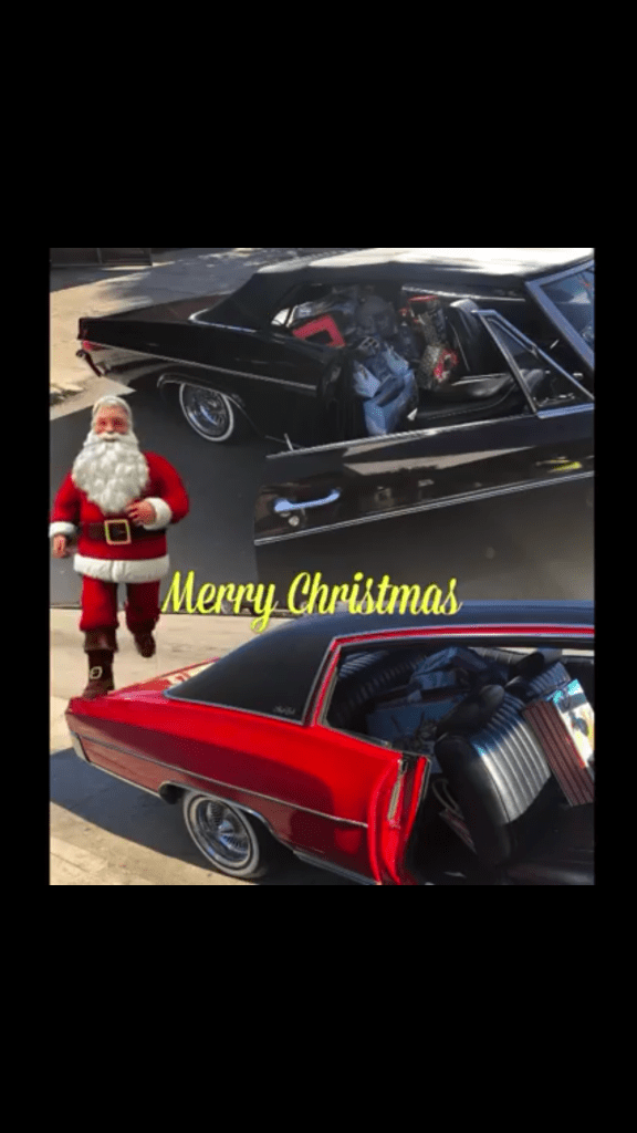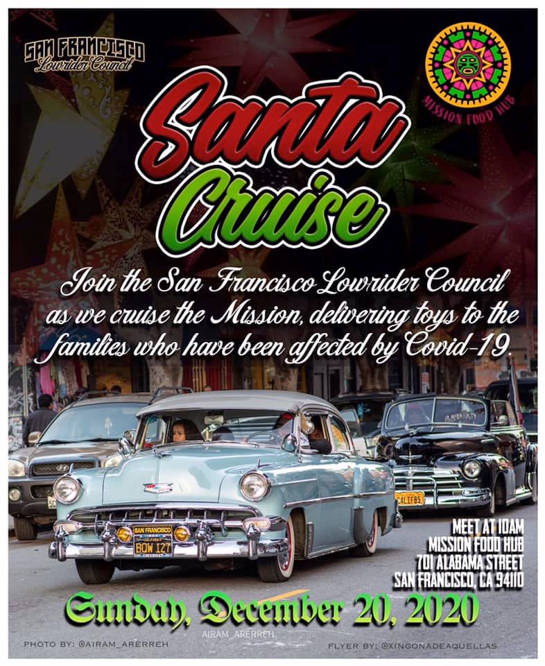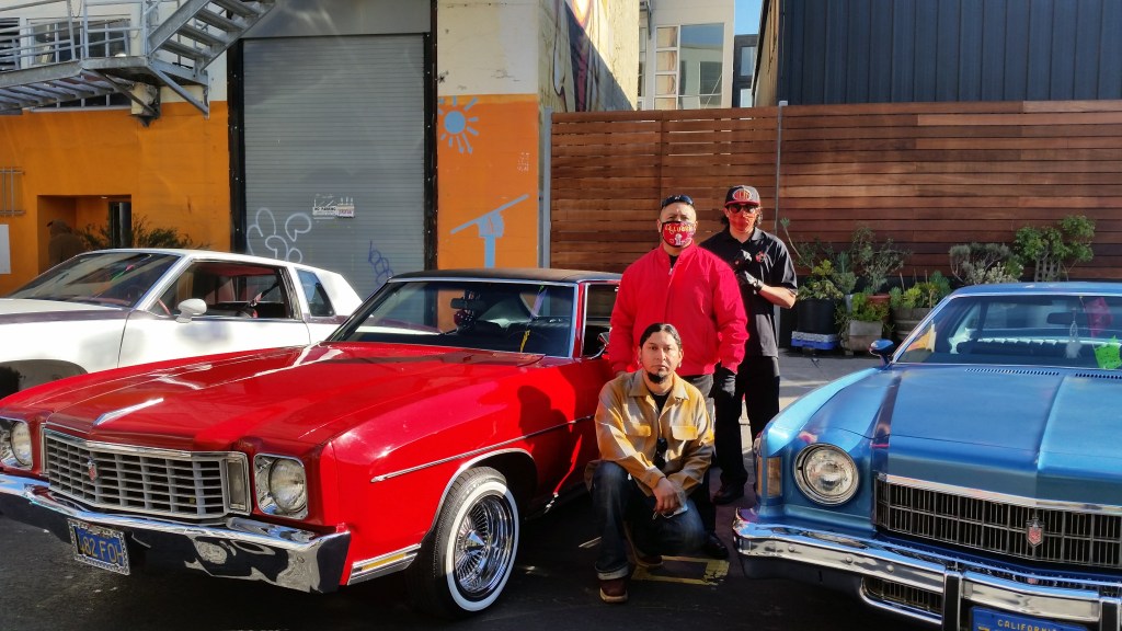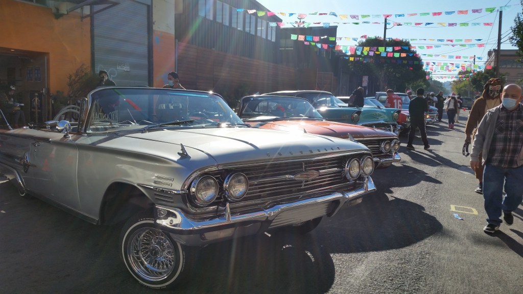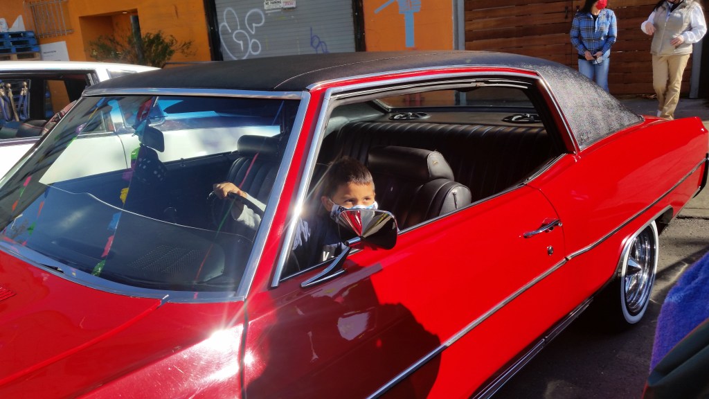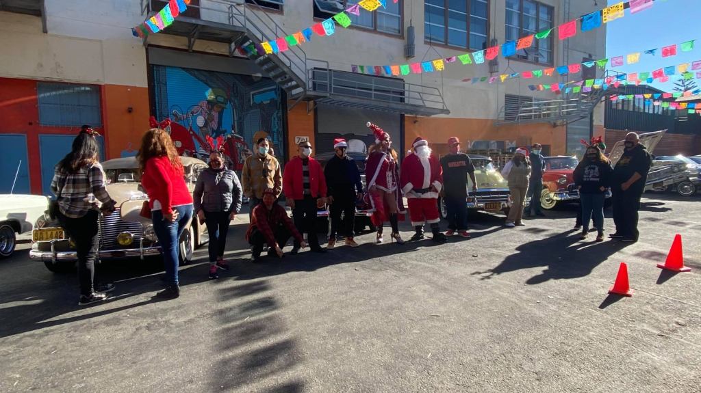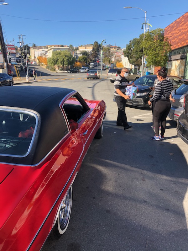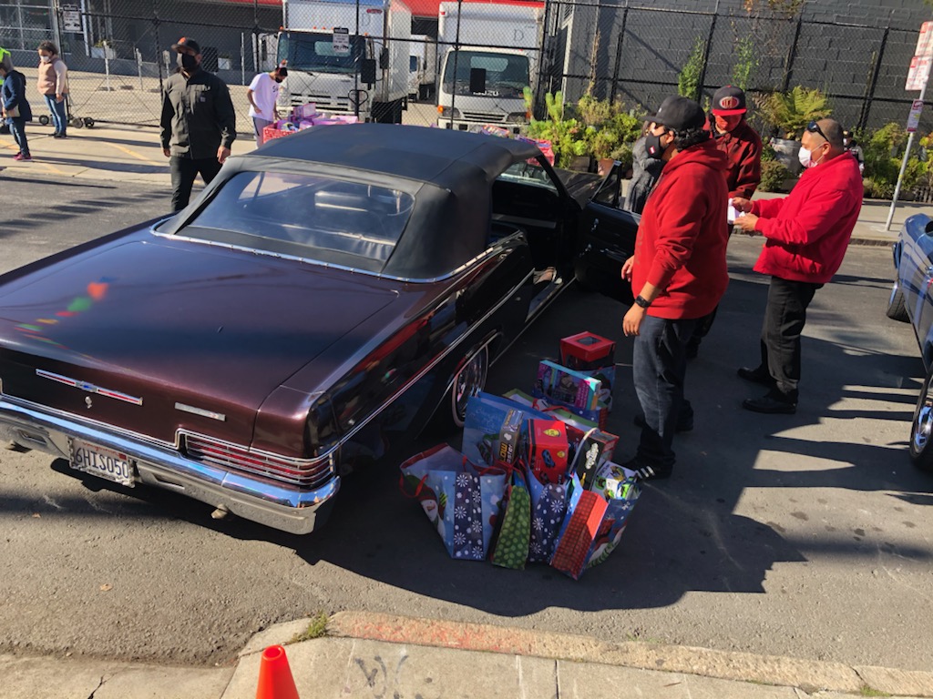 On Sunday, December 20, 2020, Santa Clause came in reindeers of gold, red, blue, metal-flaked lowrider Impalas, Monte Carlos, Cuttys, and Cadillacs with custom colorful murals and lots of love. Organized and led by many, including Roberto Hernandez, with the San Fran Mission Food Hub as headquarters, the Homeboy and Homegirl elves got all the Christmas presents ready for the beautiful familias and children in need.