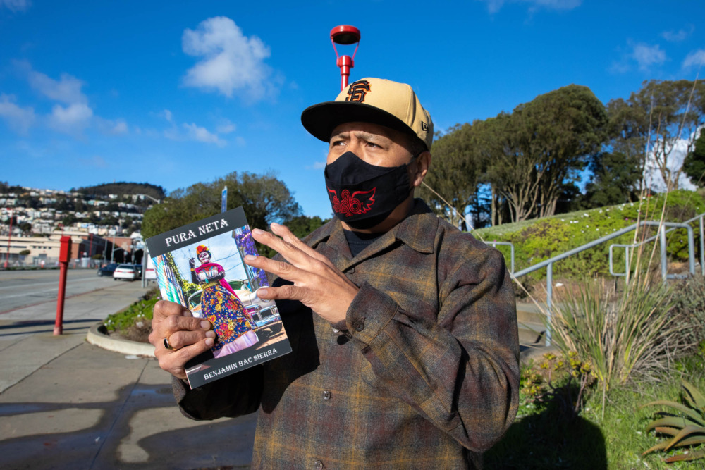 “Benjamin Bac Sierra, author of Pura Neta and City College professor, holds up his novel and stands on the sidewalk of Frida Kahlo Way on Ocean campus. Bac Sierra argues in the book that words are merely “…spider symbols. They are not true….Once you whisper a word, it is not truth anymore. Why? Because it is a symbol, it is a representation [of the truth].” San Francisco, CA. Jan. 29, 2021. Photo by Melvin Wong/The Guardsman.”