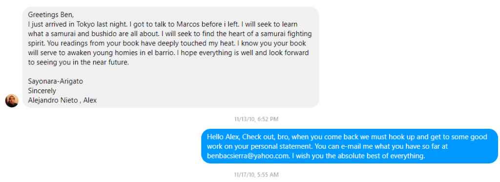 I am a vato loco, a writer, and an educator. I have always been public about my persona. Those who know me, know. When Barrio Bushido hit the streets and bookstores, Alex Nieto, who knew firsthand of my brother’s legend, fell in love with my writing and spirit and volunteered to help me with anything that I had to do to further education, literature, and amor. In 2010, Alex actually messaged me the following: “Ur story struck a deep core in my being. If you need any future work with any further books or publications, let me know.” On another occasion: “Your readings from your book have deeply touched my heart. I know your book will serve to awaken young homies in el barrio.” He would always rock the Barrio Bushido t-shirt and help me create on the street in order to build love in the community. We would greet each other, “What’s up with the Movement, Homes?!”