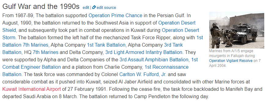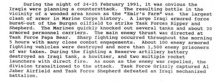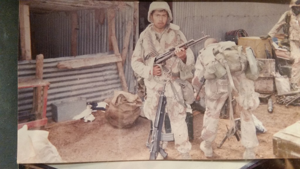 I was 19 years old, a line company grunt machinegunner 0331 in Bravo Company, 1st Batallion, 5th Marines, the most decorated infantry unit in Marine Corps history. We were part of Task Force Ripper, the first forces to fight into Kuwait. For seven months, we had lived and trained in the hell heat desert. As grunts we practiced fire-team rushes in the middle of nothing and exercised jumping into make-shift trenches in order to prepare for heavily fortified Iraqi obstacles, including endless miles of deadly minefields. We trained for trench warfare, World War One style combat, but we were ready for anything, even nuclear war.
