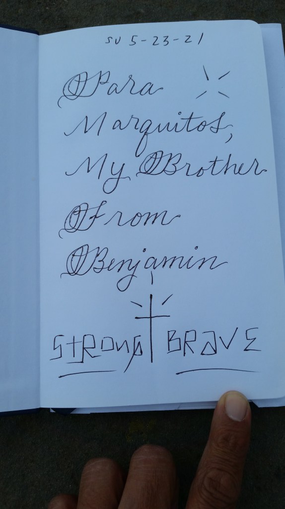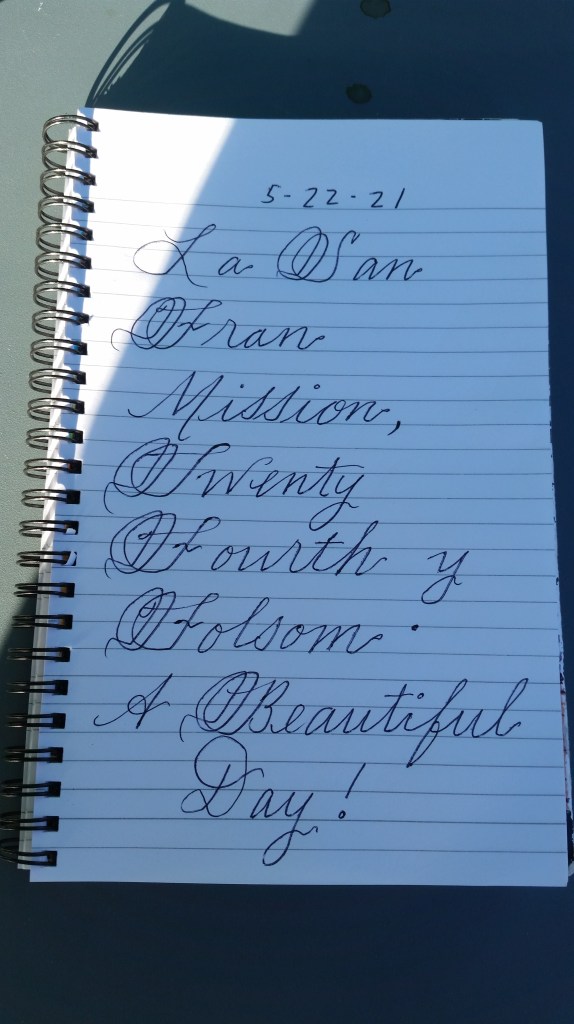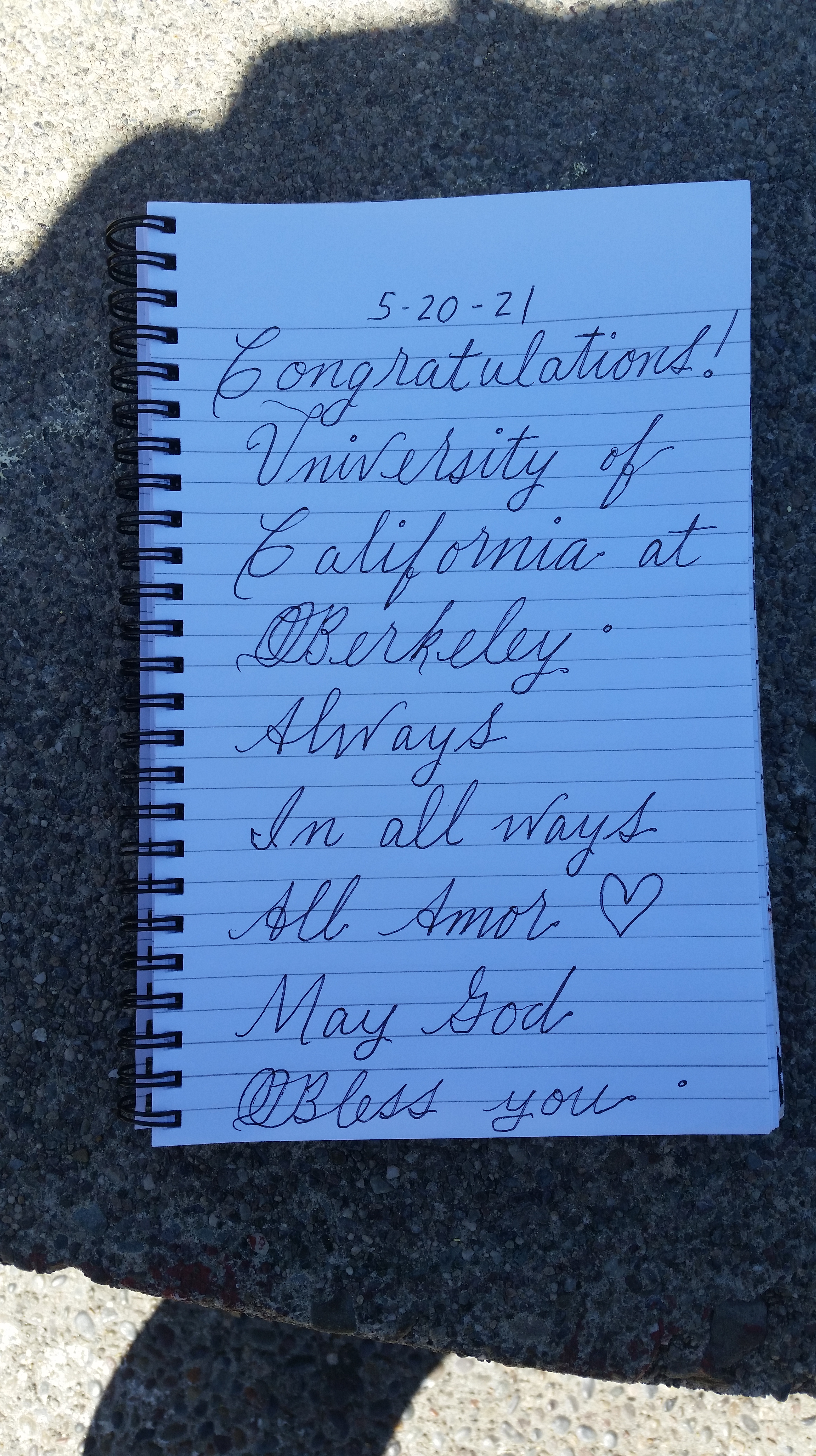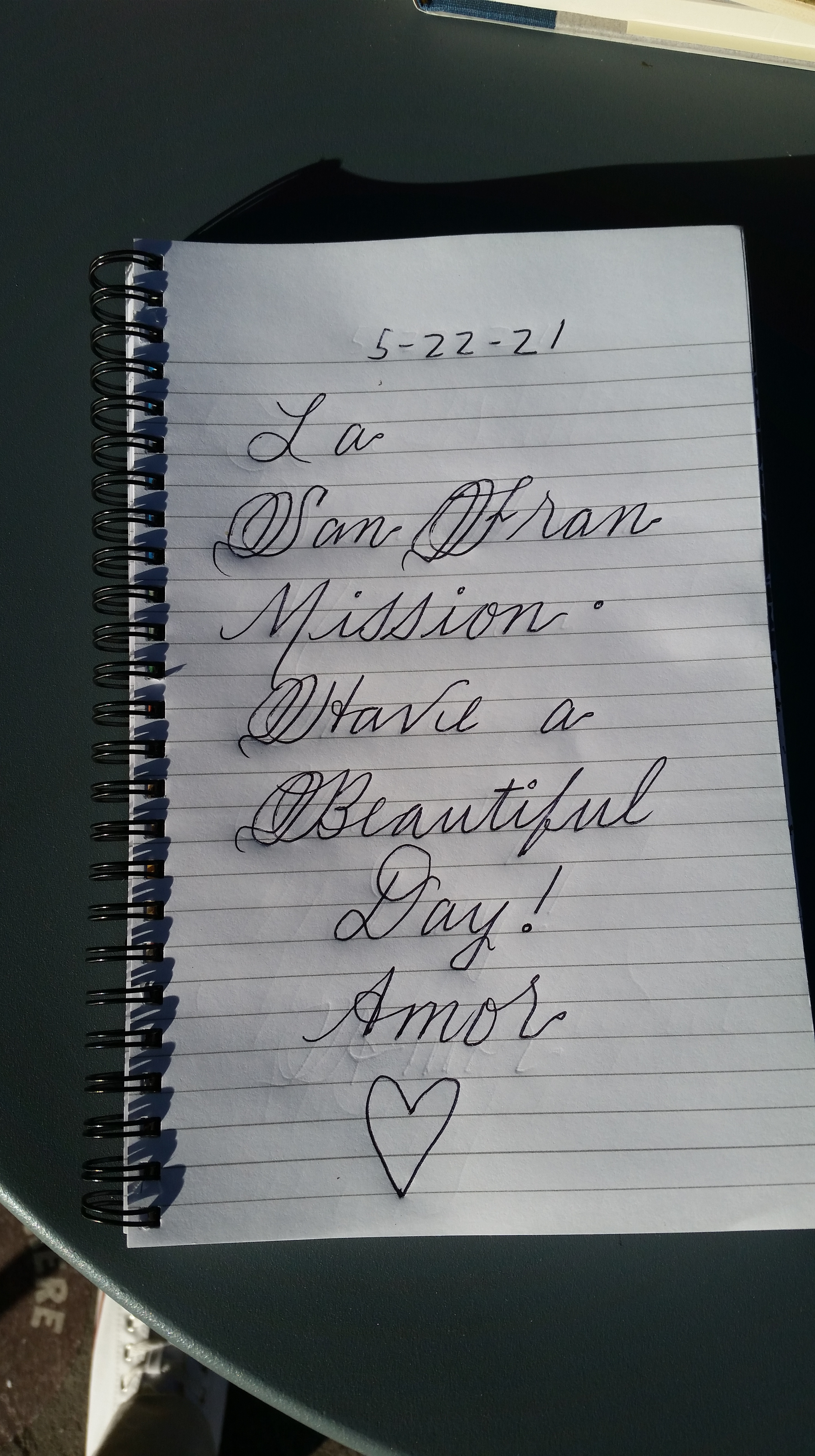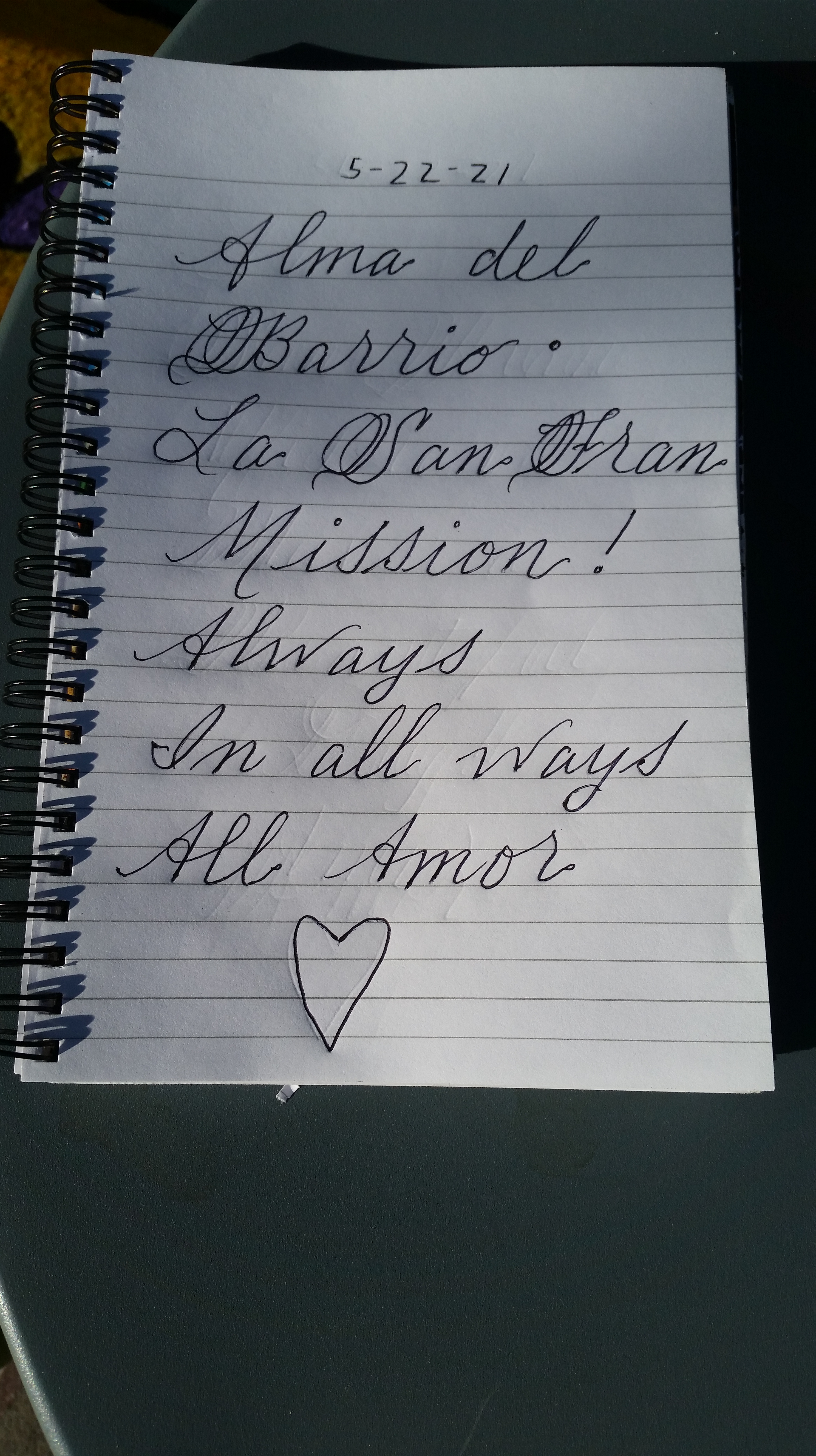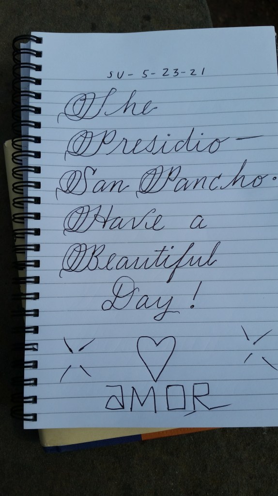 Redemption is for others.For the past week I have been going to different places here in the Bay Area and reading, writing, drinking some cafecito, listening to Sol Soul Oldies, and handwriting out calligraphy script for perfect strangers. I do not introduce myself, and I do not ask their names. I hand them the piece of notebook paper and simply offer them amor. We will never see each other again. Spirit matters most. Sather Gate, U.C. BerkeleyGiven to a history majorGiven to a baristaGiven to two workers who placed it on the dash of their truckGiven to a family on the streetGiven to Mi Madre Querida, MargaritaTwinsFor my Strong and Brave BrotherAt the San Pancho PresidioGiven to a couple who were marveling at the viewThis young Brother climbed out of the bushes and was headed to work. It is impossible and absurd and all amor that he is wearing a sweatshirt stating Angel Dust, which was our hallucination of choice in the 1980’s vida loca varrios. He confided to us that he had never smoked a maton. BennyGitanos