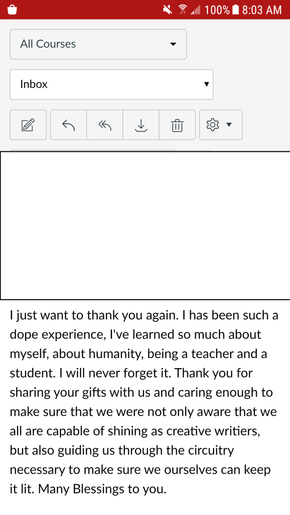 “I just want to thank you again. It has been such a dope experience. I’ve learned so much about myself, about humanity, being a teacher, and a student. I will never forget it. Thank you for sharing your gifts with us and caring enough to make sure that we were not only aware that we are all capable of shining as creative writers, but also guiding us through the circuitry necessary to make sure we ourselves keep it lit. Many Blessings to you.”