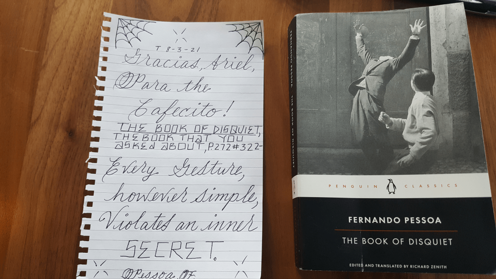 “Gracias, Ariel, para the cafecito! The Book of Disquiet, the book that you asked about, p. 272 #322—Every gesture, however simple, violates an inner secret. Pessoa, F.”