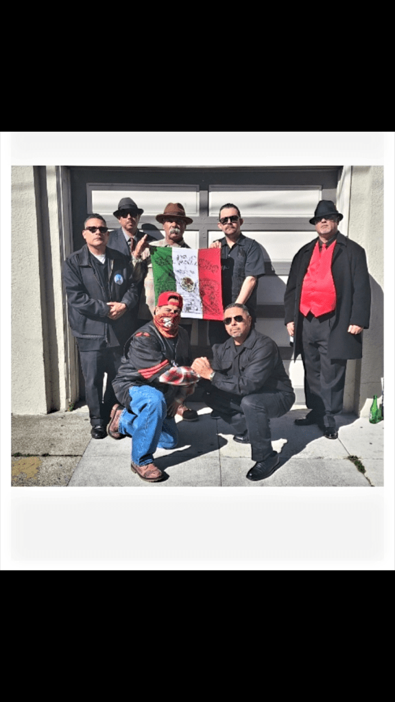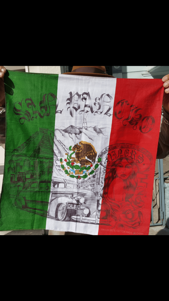 George had gifted OG Veterano Benny a beautiful pañuelo, a handkerchief style bandana that is used as a canvas for intricate pen art. This pañuelo had imprinted on it a Mexican flag. In black ink, there was Olde English cholo style calligraphy that spelled out San Pancho, the Saint who called the sun his brother and the moon his sister. Underneath our City’s name, there was drawn a collage of Sutro Tower, Twin Peaks, an Aztec Pyramid, the city skyscrapers, a 40’s style gangster bomba, and a Mexican homegirl wearing a “Niners” sombrero.