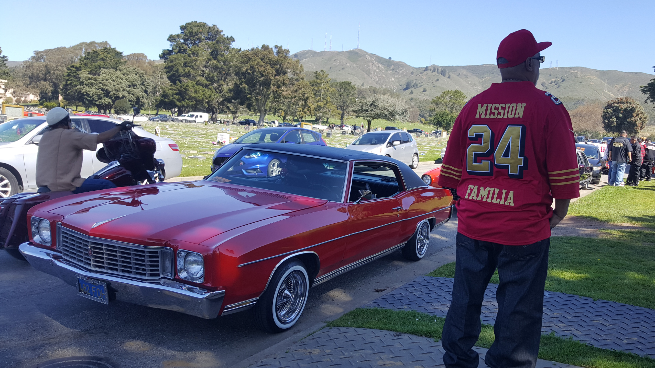 Mitch Salazar’s grandsons carried his body from the church back into the hearse. The Bikers blocked traffic from the streets. The Lowriders followed him in one last cruise down 24th Street and the whole stretch of Mission Street. A beautiful Sister had asked if I could cruise her nephew and daughter to the burial, so we blasted the Soul oldies, and they were in the backseat dancing and having a blast. By the time we were in Daly City, we were all racing each other on the streets, while Young Loved Ones sat outside the windows of their rides.