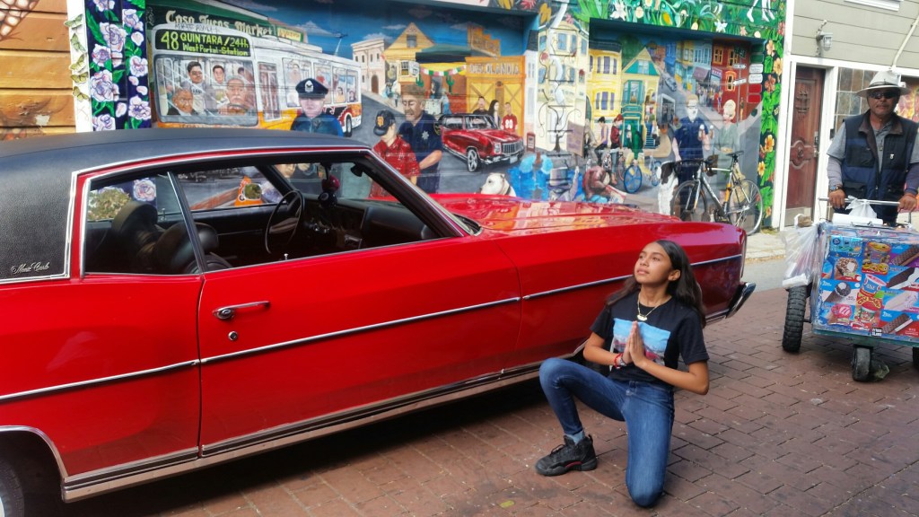 A woman walks down 24th, turns right onto Balmy Alley, and pauses to flex at the Mission Makeover Mural.