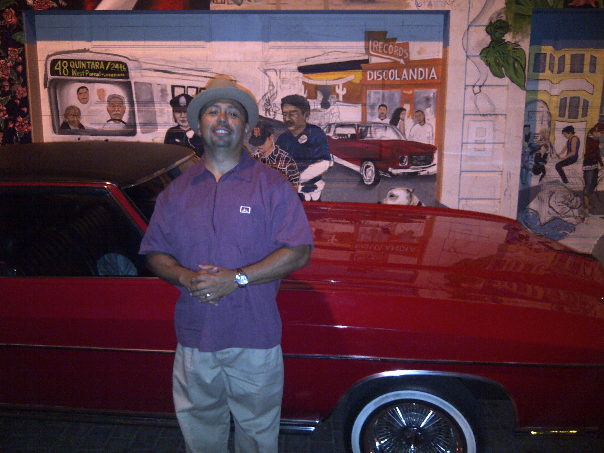 A woman walks down 24th, turns right onto Balmy Alley, and pauses to flex at the Mission Makeover Mural.