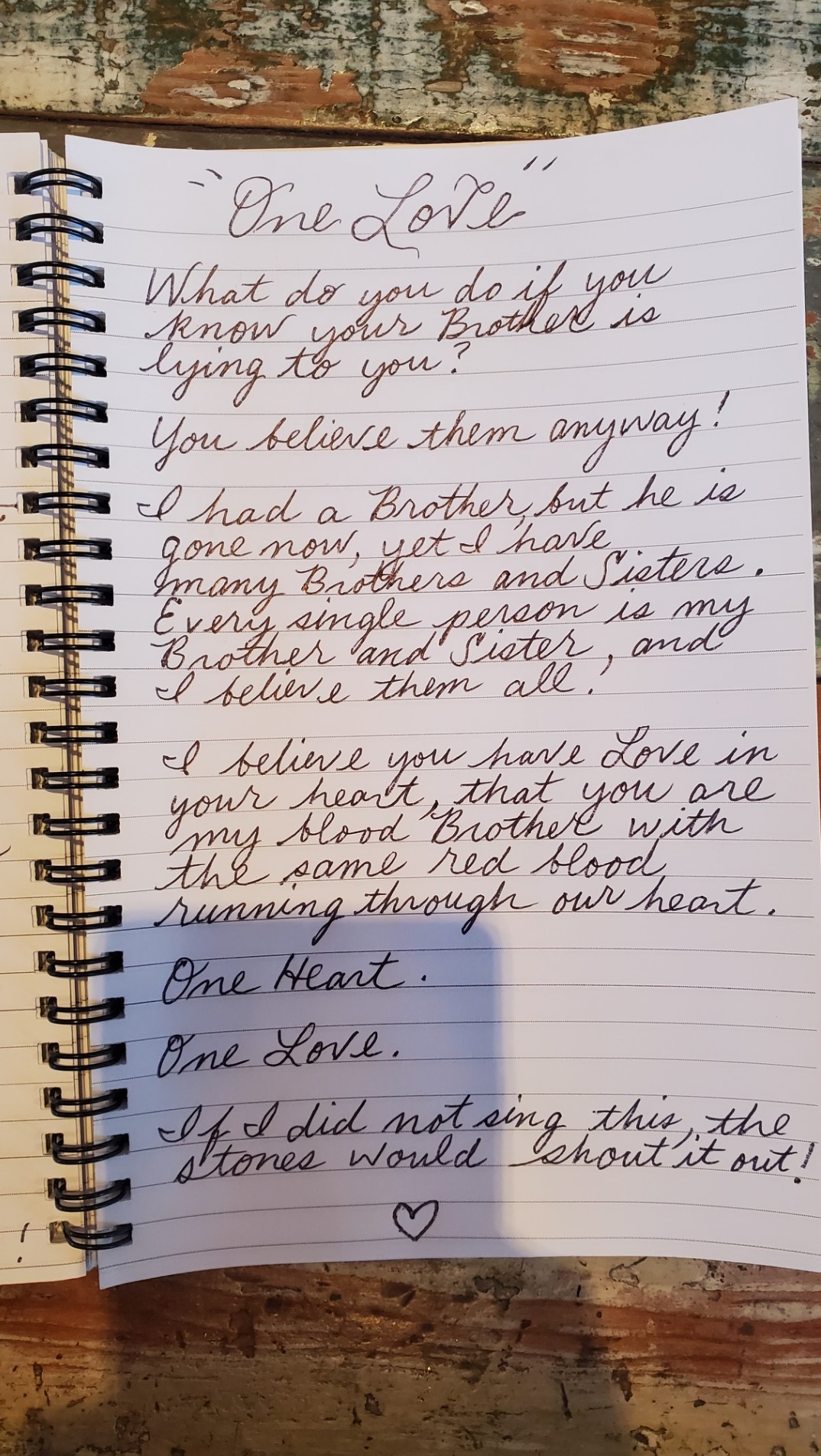I believe you have Love in your heart, that you are my blood Brother with the same red blood running through our Heart.