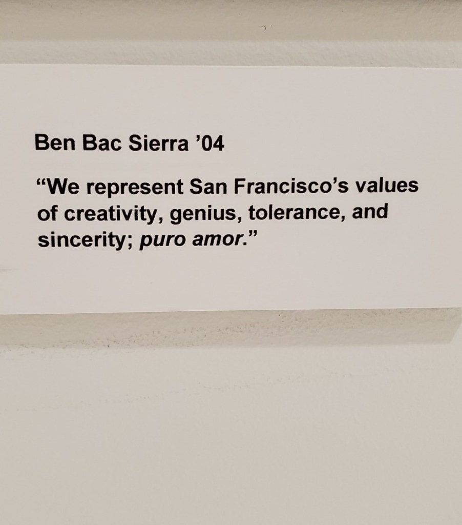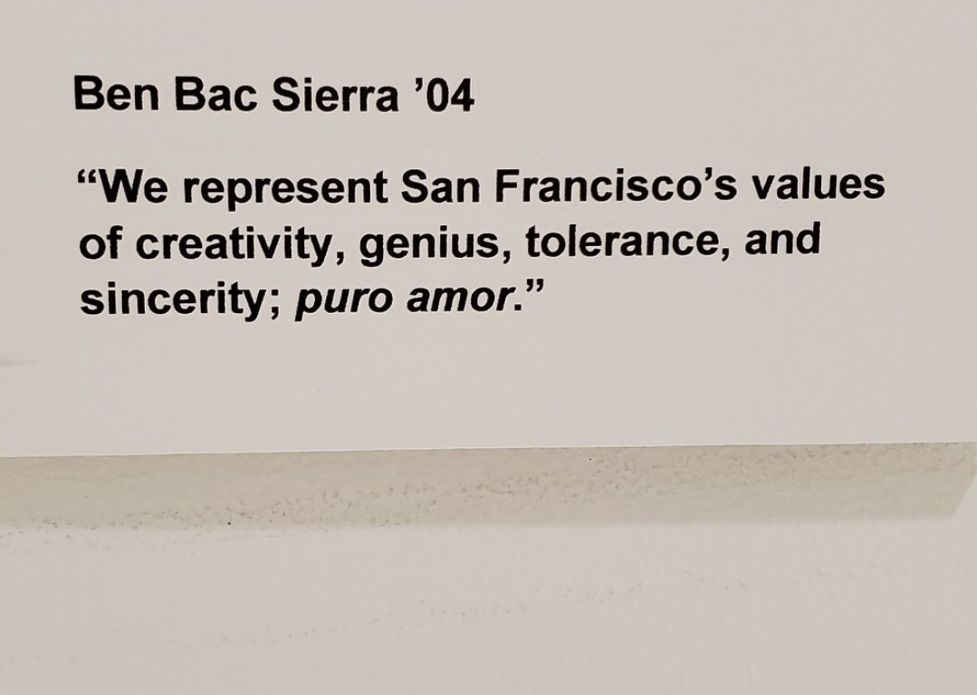 Underneath it is my name and a quote from that 2010 magazine article. In it I was saying that “we [the locos y locas] represent San Francisco’s values of creativity, genius, tolerance, and sincerity: Puro Amor.”