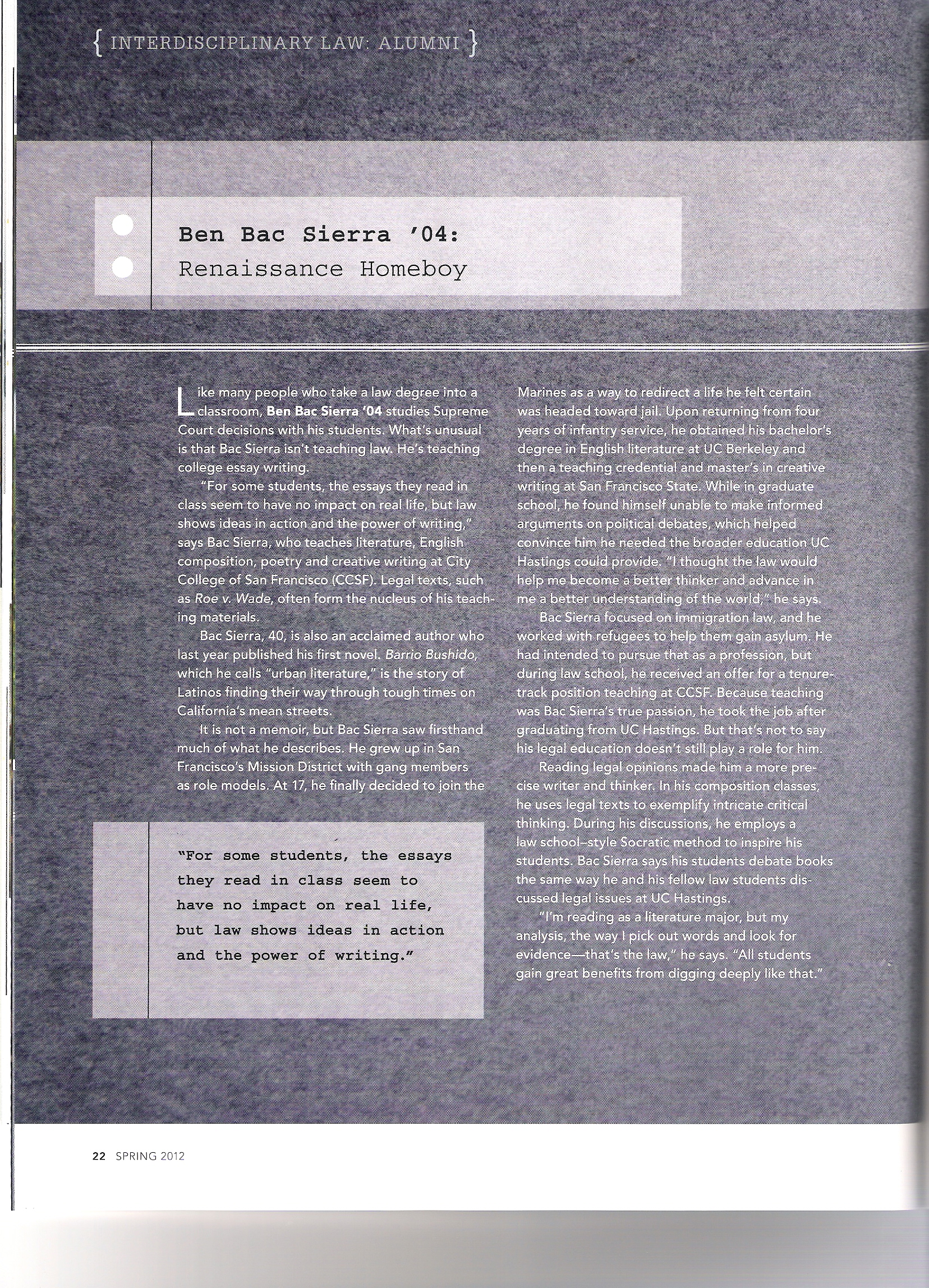 In 2010, when my first book Barrio Bushido was published, the law school’s magazine wrote an article about me. They sent a photographer to meet me at City College of San Francisco (where I have now been teaching for 22 years). I suggested we take photos inside of the Diego Rivera Theater in front of Rivera’s Pan American Unity Mural.